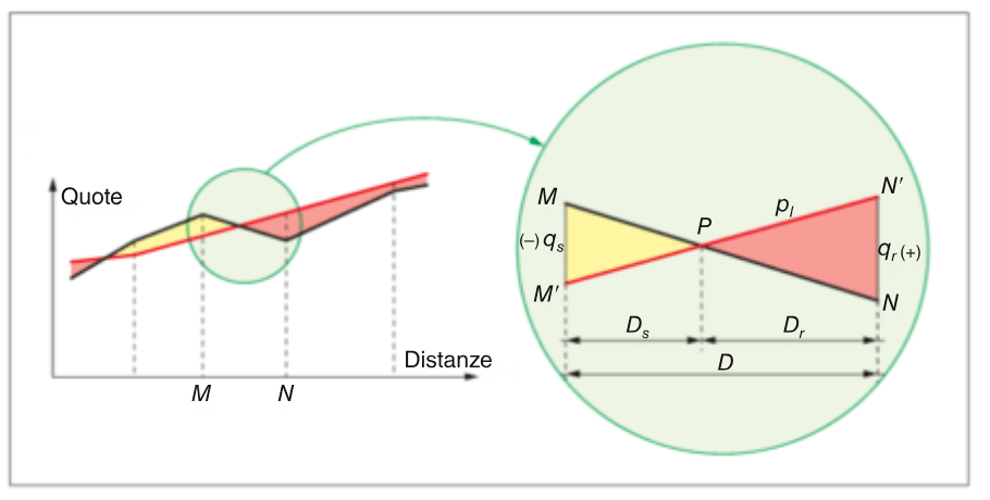 Tra queste infinite possibilità si predilige che le livellette inserite diano luogo ad un compenso longitudinale, ovvero che le aree di sterro e di riporto definite dalla differenza tra profilo nero e profilo rosso si eguaglino: è un compenso che però non ha niente a che vedere con i reali movimenti di terra, non è un compenso di volumi e non tiene di conto dell’andamento trasversale dell’opera.